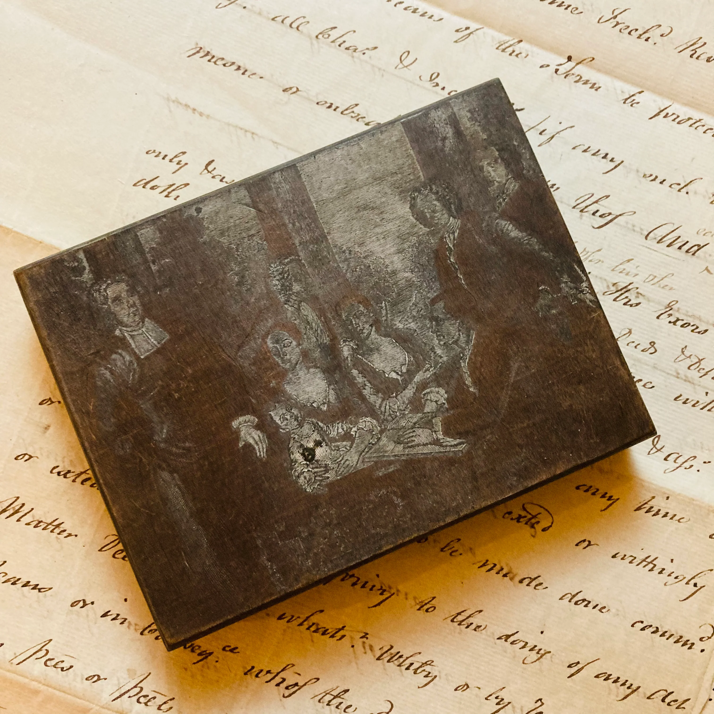 Discover a rare French antique etched steel printing plate from the early 19th century, featuring a finely detailed oil painting scene of gentlemen, ladies, and a child. Mounted on a wooden block, this exquisite piece showcases remarkable craftsmanship and intricate detail, making it a unique collector’s item. Ideal for decorative use, these plates add vintage charm when displayed without glass in a frame or arranged as wall tiles for a distinctive artistic project. Perfect for enthusiasts of historical printing techniques and antique décor, this steel plate offers both aesthetic appeal and a tangible connection to early 19th-century artistry.