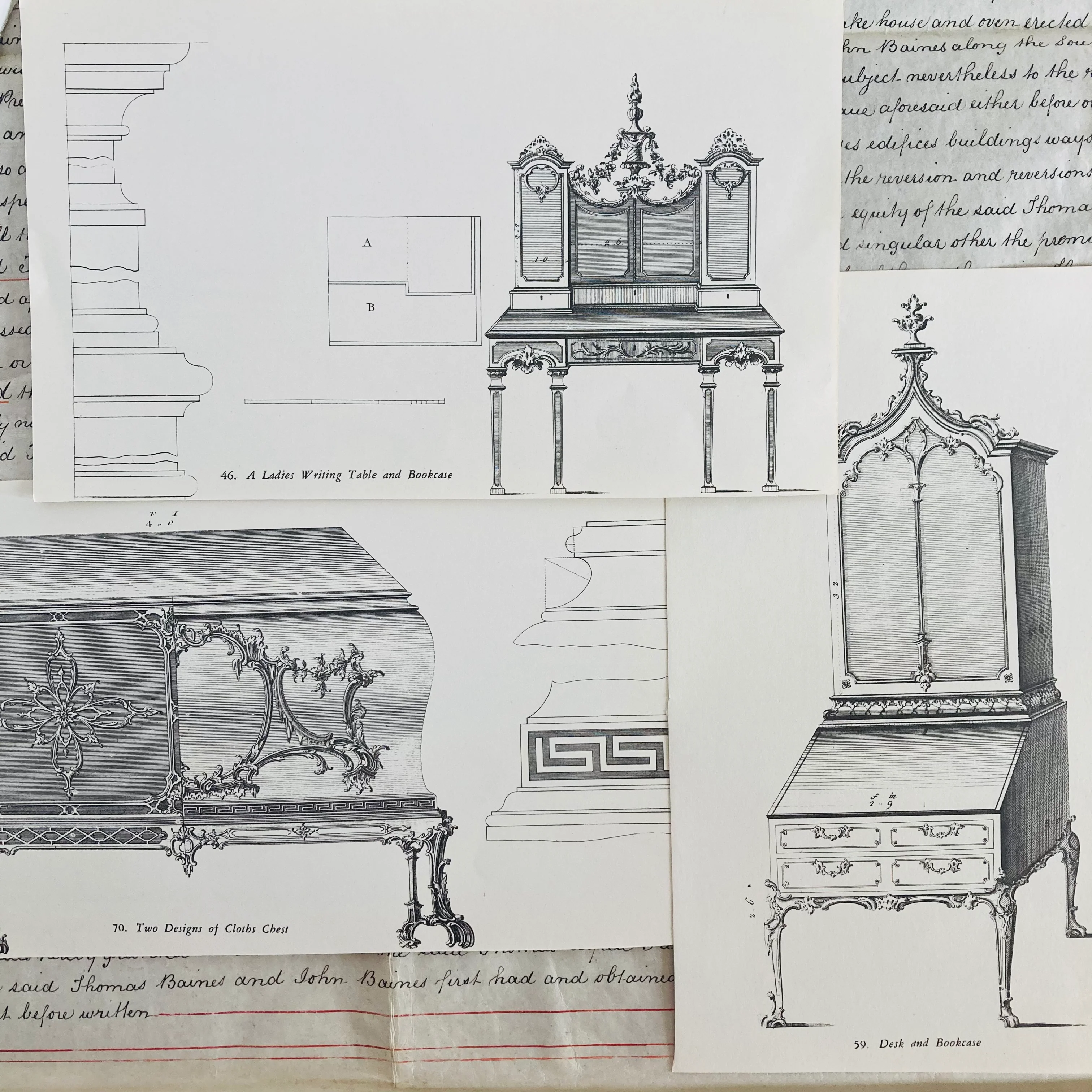 Engraved copper plate designs from the design reference book The Gentleman and Cabinet-Maker's Director Thomas Chippendale. These designs have been reprinted onto these book sheets which were first published in 1762. Some pages also have designs on the reverse.