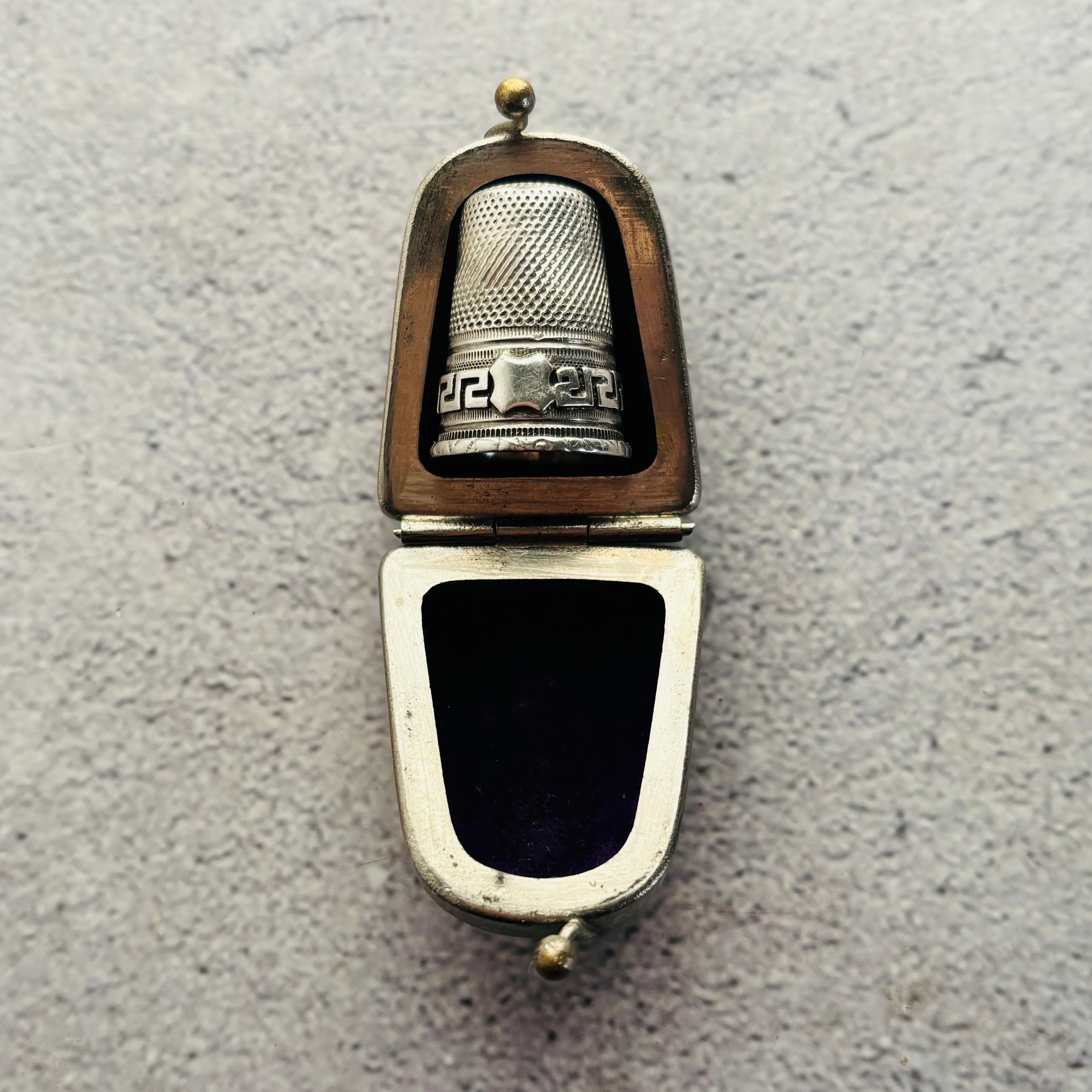 Antique sterling silver sewing thimble featuring an elegant Greek key hole design with a vacant shield cartouche, ready for personalisation or display. The thimble tests positive for silver with no hallmarks, presenting an authentic piece of vintage craftsmanship in lovely condition. Accompanied by its original white metal and leather case lined with sumptuous purple velvet, which snaps securely closed. The leather exhibits natural patina and age-appropriate wear, adding to its provenance and character. This collectible thimble serves equally well as a functional tool for serious sewers and fashion designers or as a curated addition to a vintage sewing collection. A refined gift for those who appreciate both utility and historical craftsmanship.