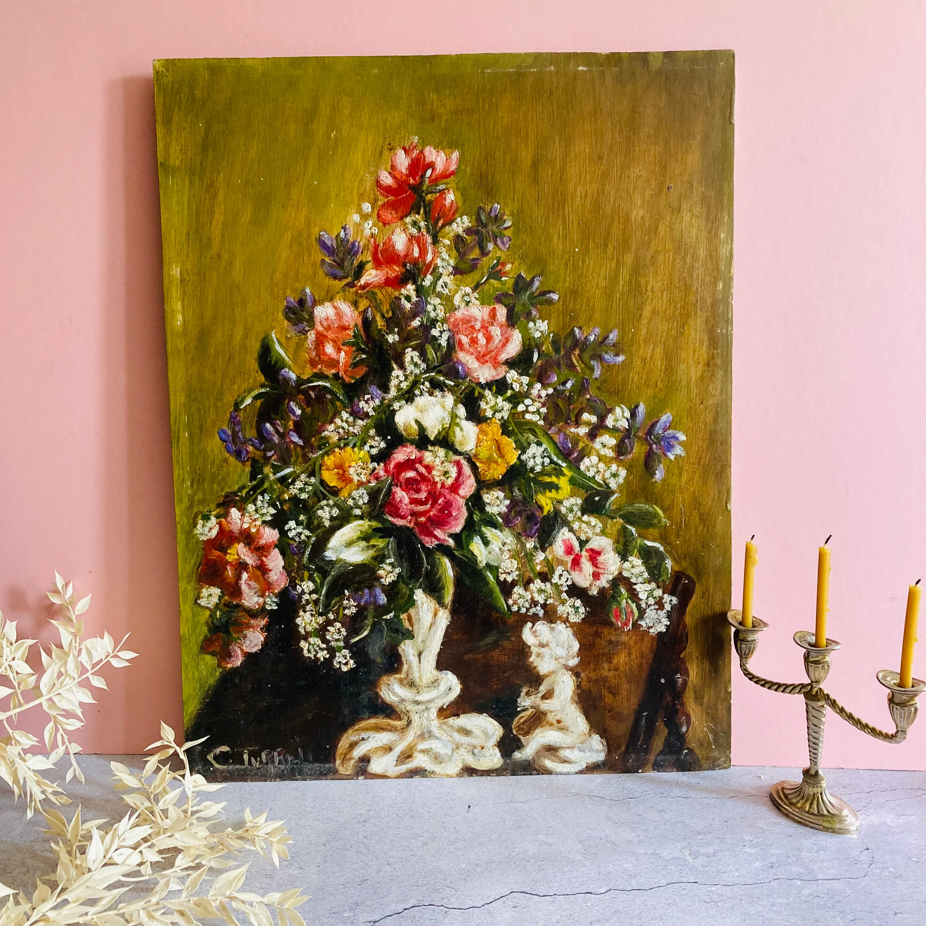 Bouquet of pink carnations in a white vase sitting next to a white cherub figurine