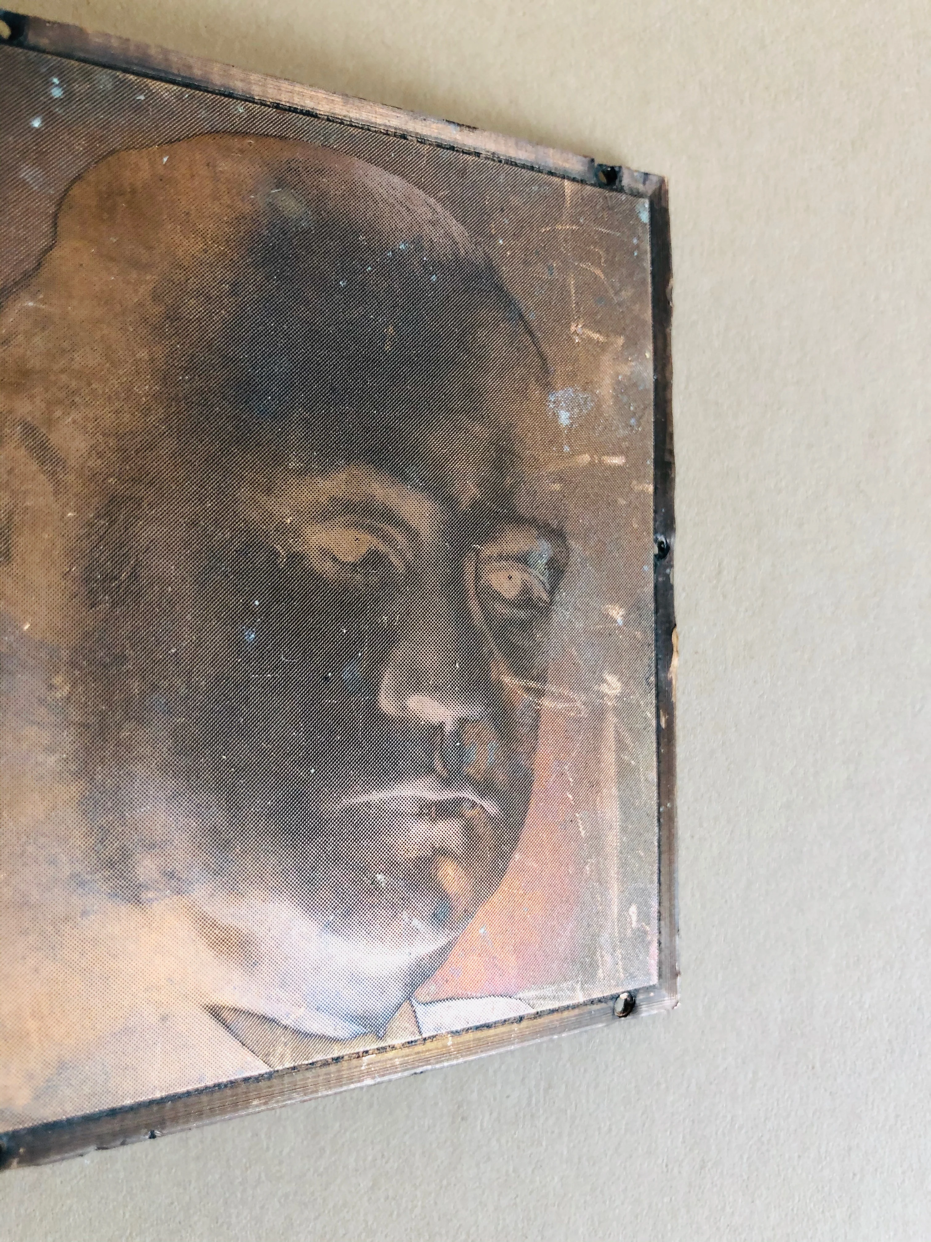 The Director Evan features a detailed portrait of an older gentleman, captured with precision on a pair of small vintage copper printing plates. Both plates are nearly identical, showcasing the craftsmanship involved in their creation.