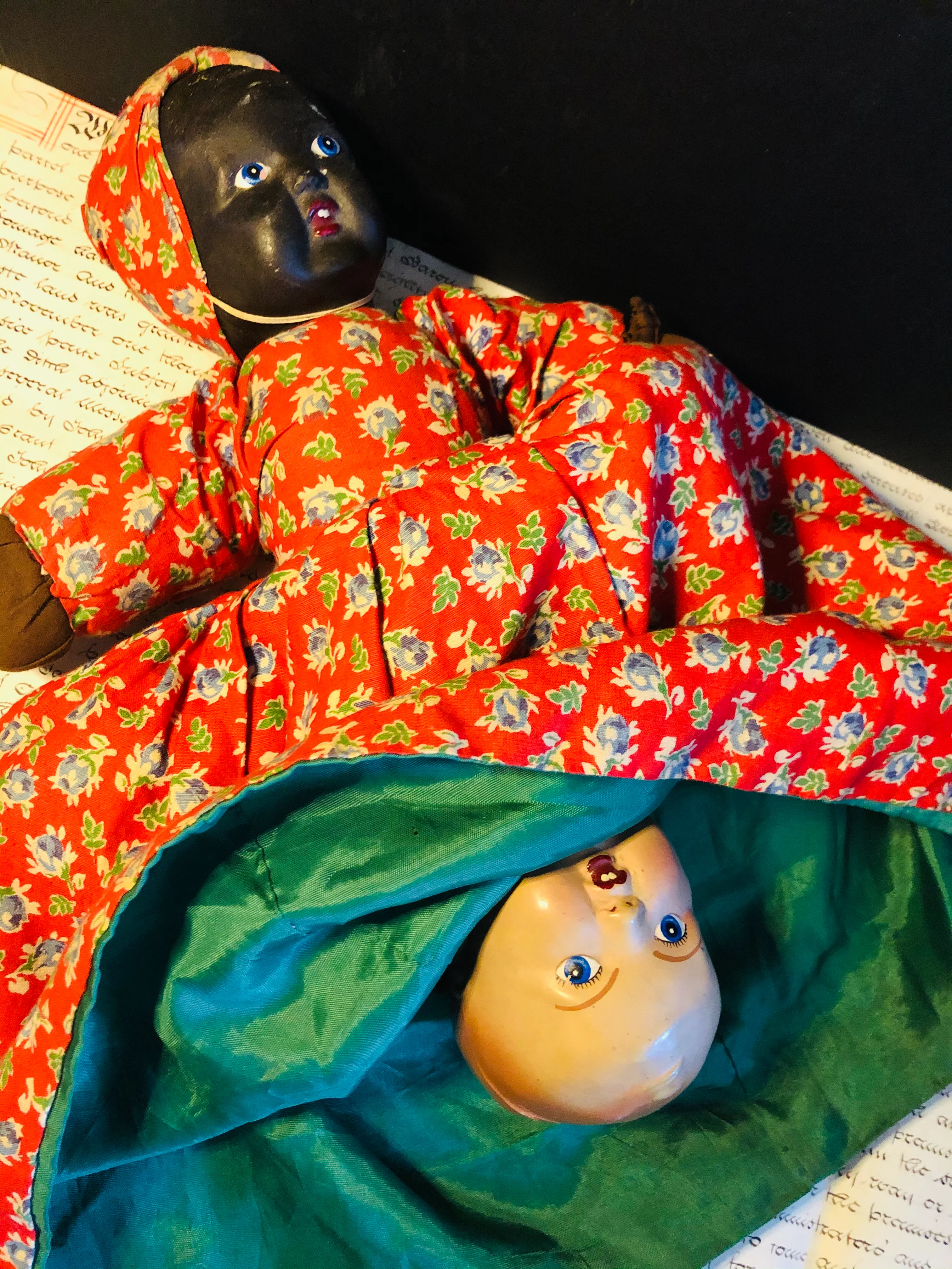 These dolls were once commonplace, yet Lola stands out with her hand-painted resin faces and vintage attire. A vibrant red and blue floral cotton dress on one side, and a rich emerald green taffeta on the other.