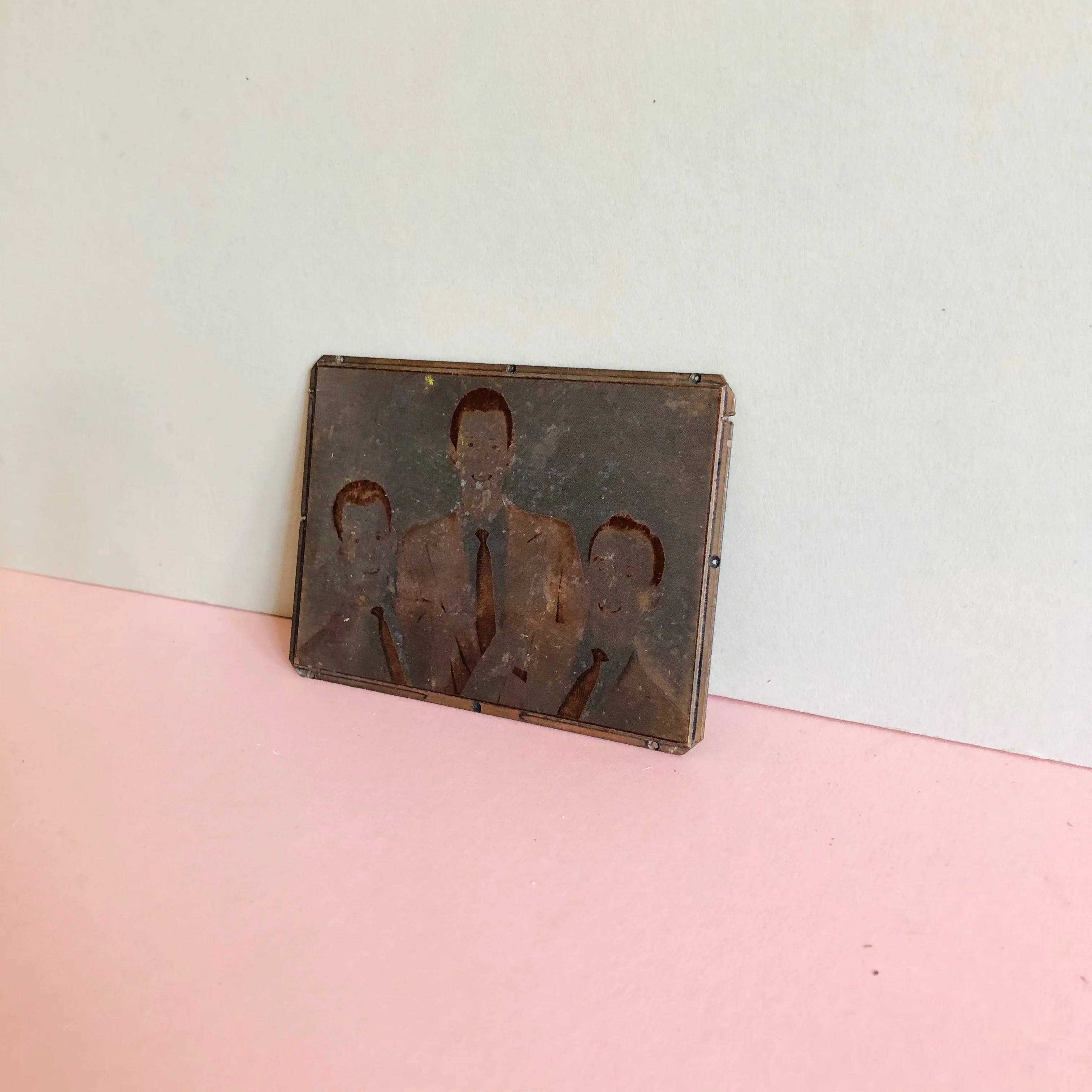 The Director Louis vintage copper printing plate features a detailed image of three well-groomed men in suits, likely singers or actors, captured in a moment of camaraderie and charm. This commercial printing plate dates back to the early 20th century, serving as a rare artifact that offers valuable insight into the cultural and social life of that era. Crafted from copper, the plate reflects the printing techniques of its time and stands as a testament to the craftsmanship and artistic standards of early commercial imagery. Ideal for collectors and historians, it provides a tangible connection to the past through its preserved visual narrative.