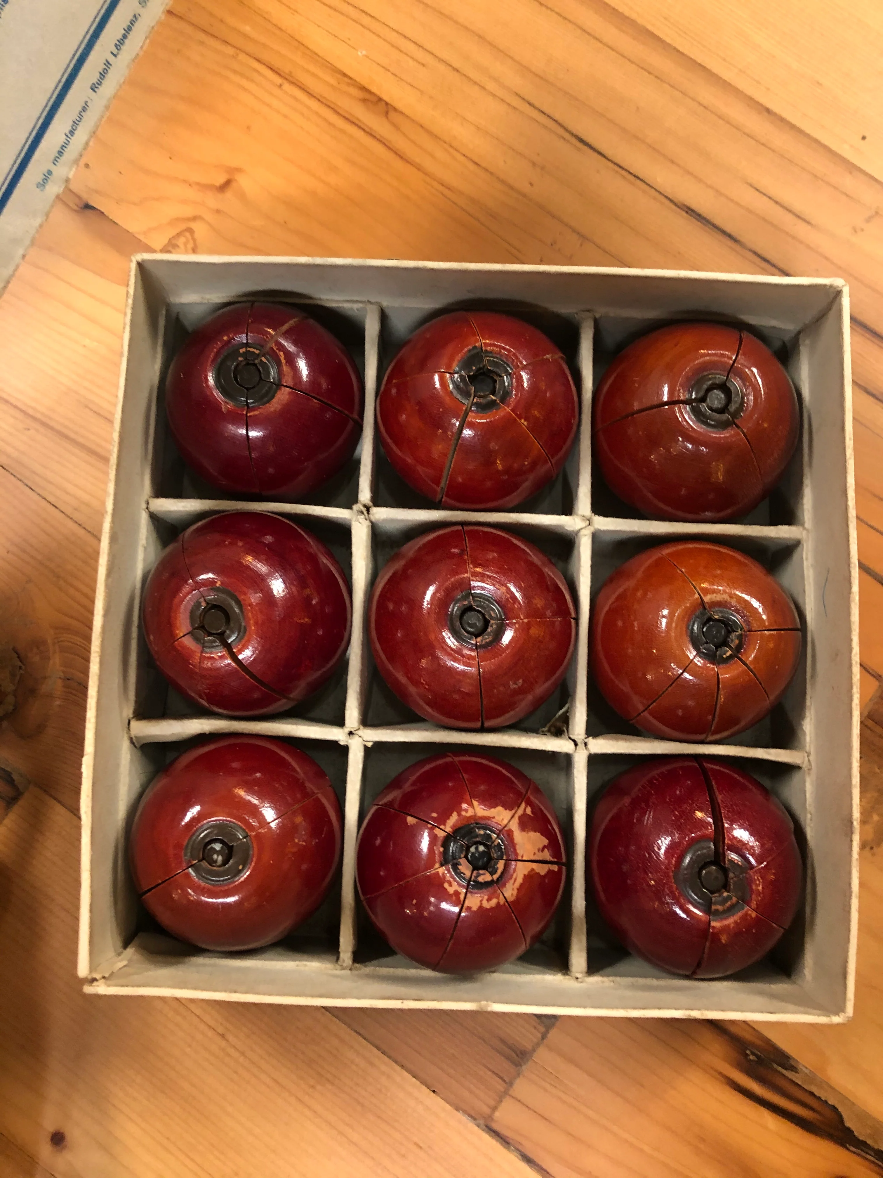 The label inside the box lid reads: “ARCHIMEDES” (/) the divisible apple to learn the calculation of fractions.; Made in Germany; Protected by patent in all civilised countries [/] D.R.P. No. 489 439;