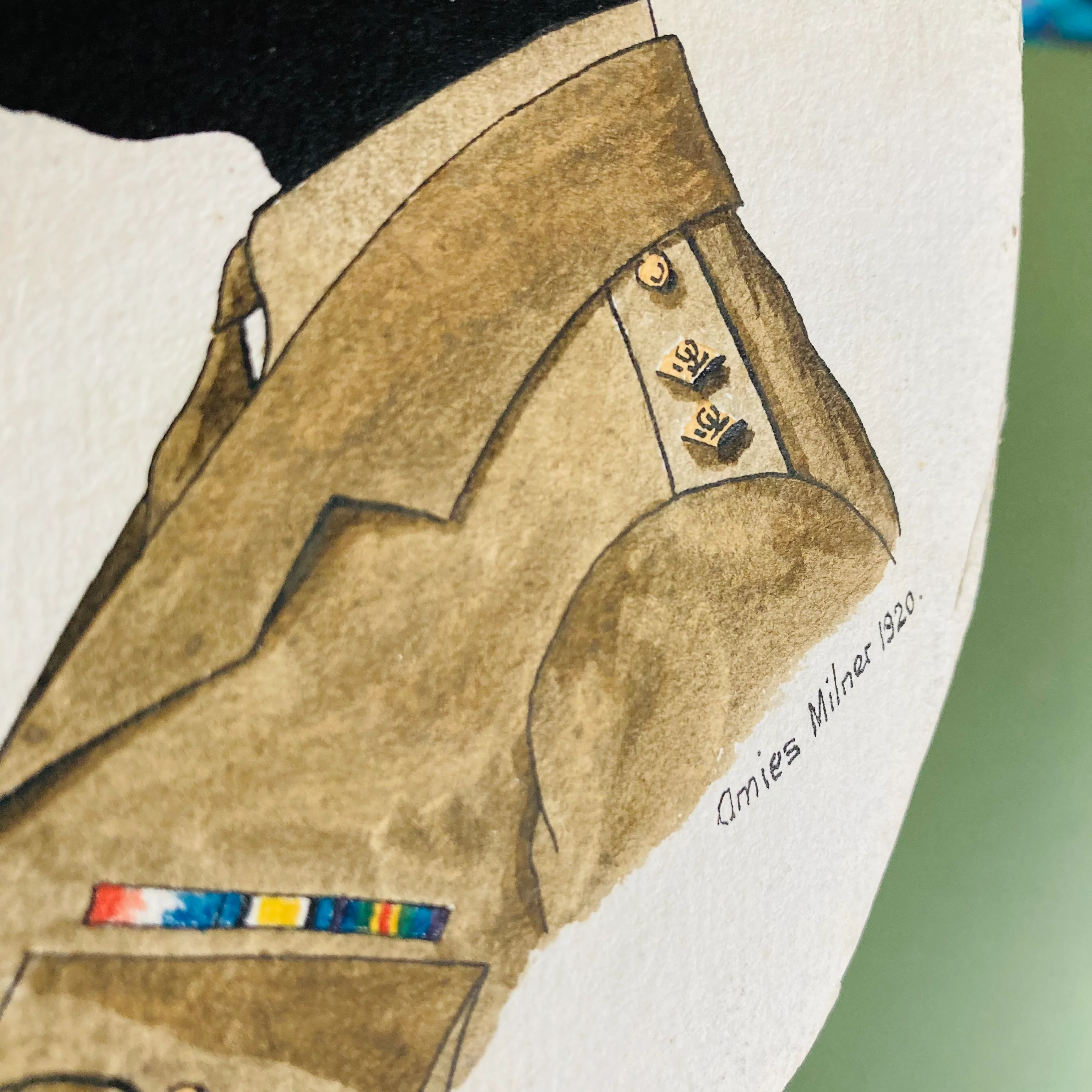 This artwork actually pre dates his well know caricature work, as Amies Milner was know for specialising in military caricatures and he drew several of the 2nd Battalion Royal Fusiliers in 1930, when they were based in Colchester.
