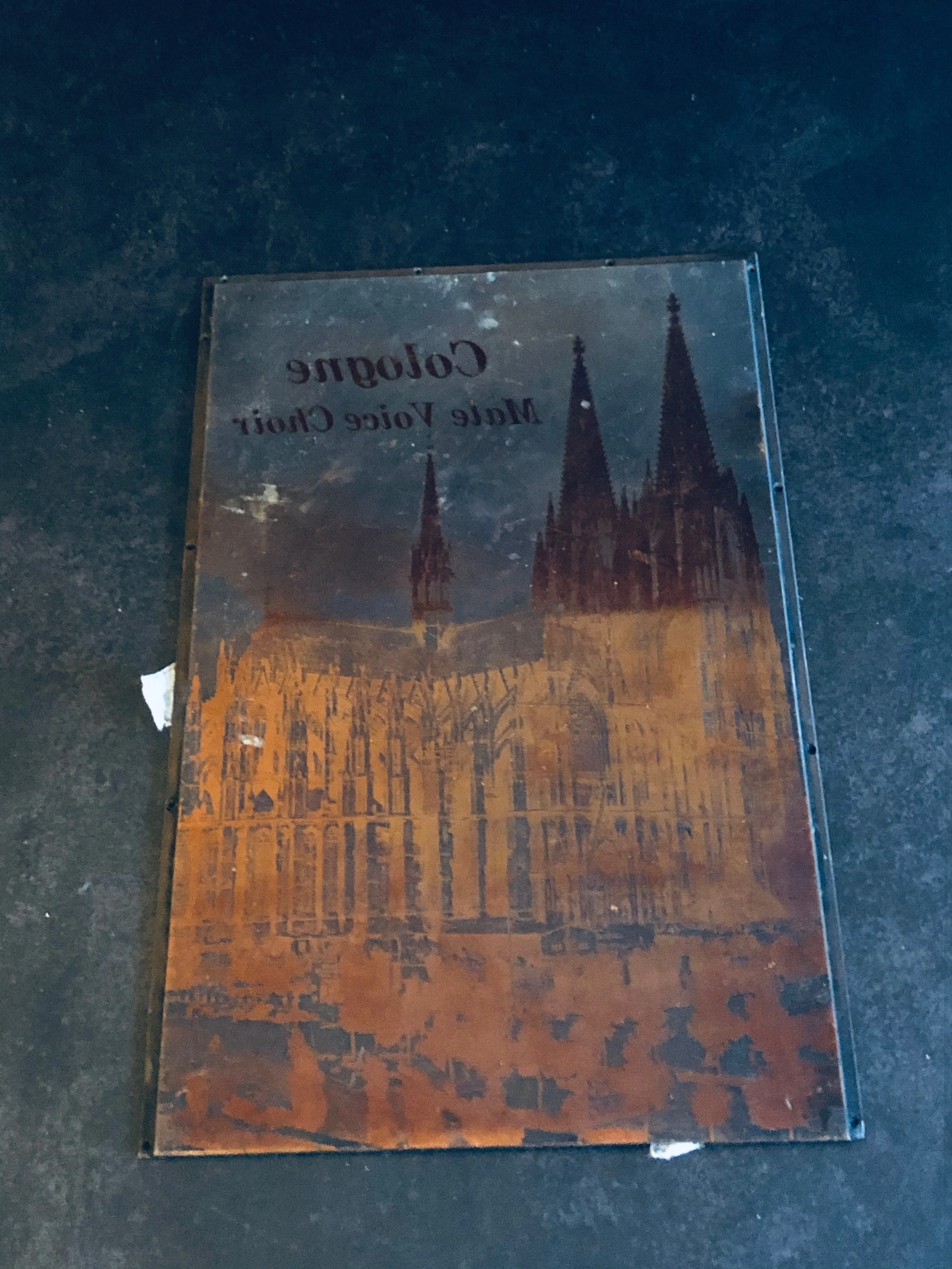 The Director Vince is a large imagery of a cathedral on a copper printing plate. It has the remains of the magazine pages featuring The Cologne Mens Choir. Which is likely to also be linked to the Russian play Don Cossack Chorus & Dance.