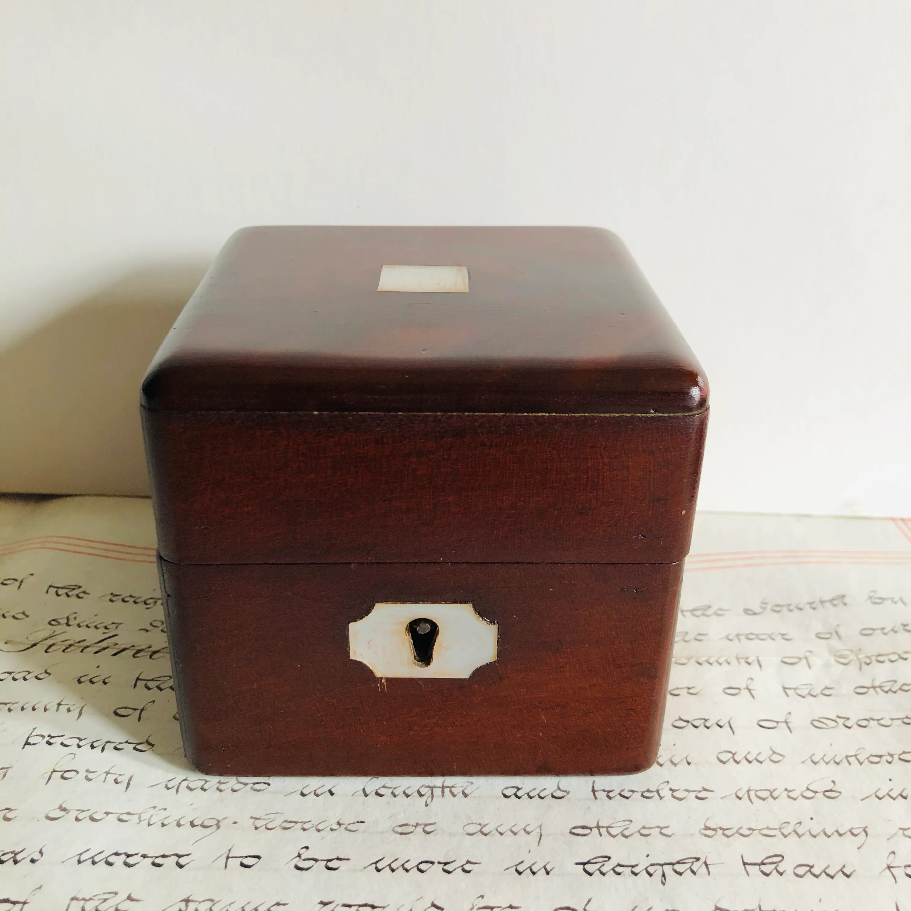 She is made in mahogany with mother of pearl inlay at the lid and front lock