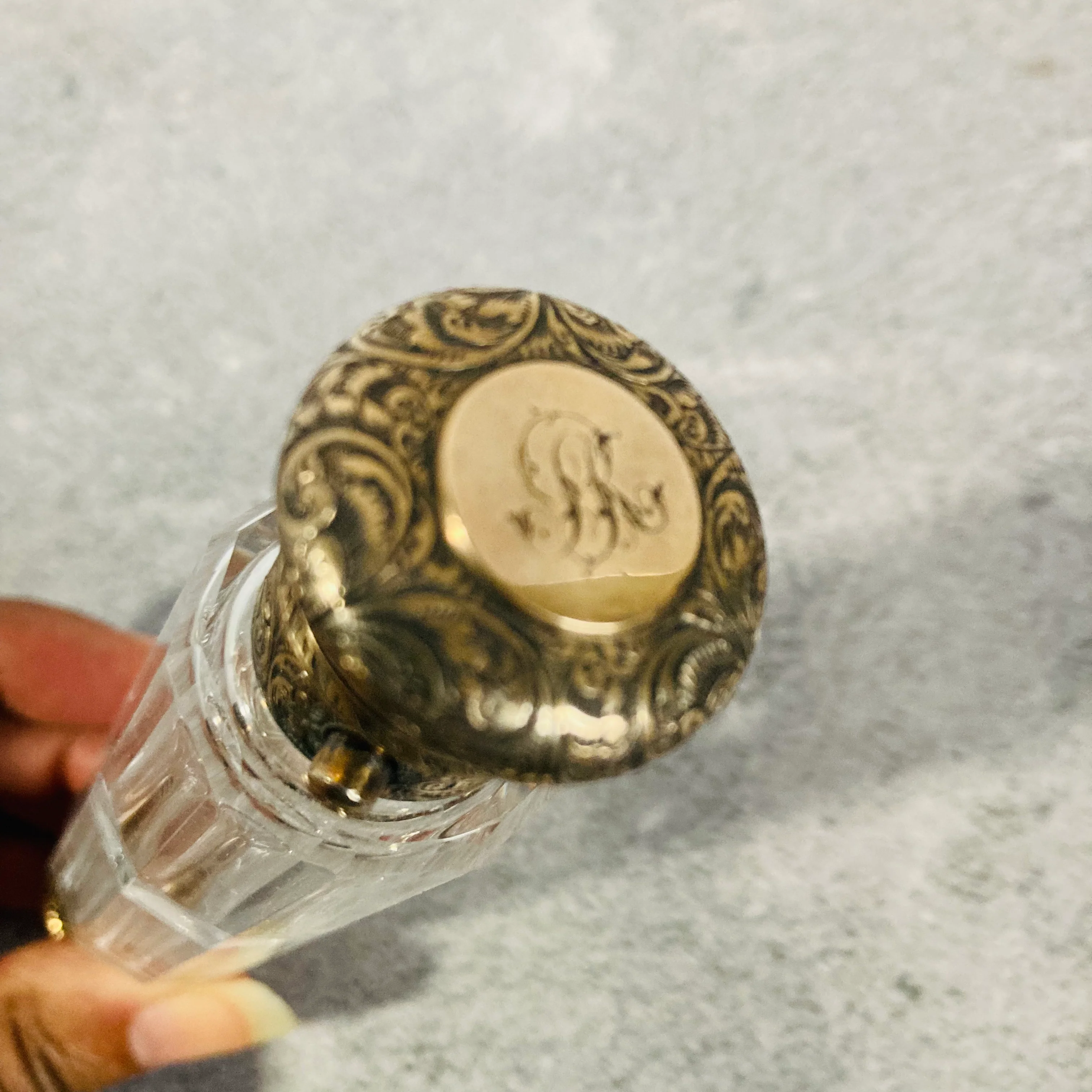 He is a container with facetted glass with a decagonal body shape and stunning silver gilt detailed engravings of swirl and acanthus leaves