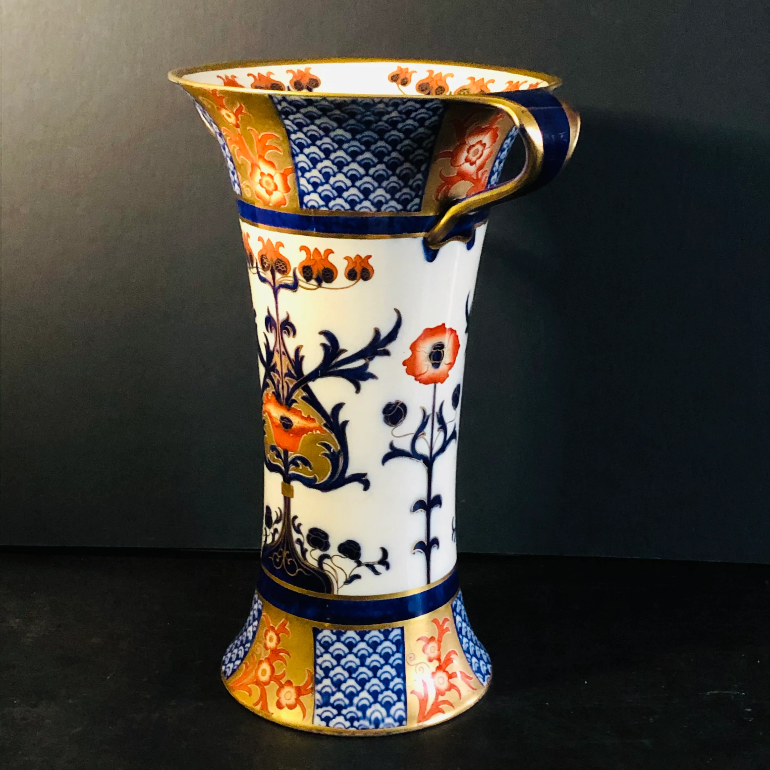 She is an impressive tall twin handle vase enriched with red and blue enamel and gilding.