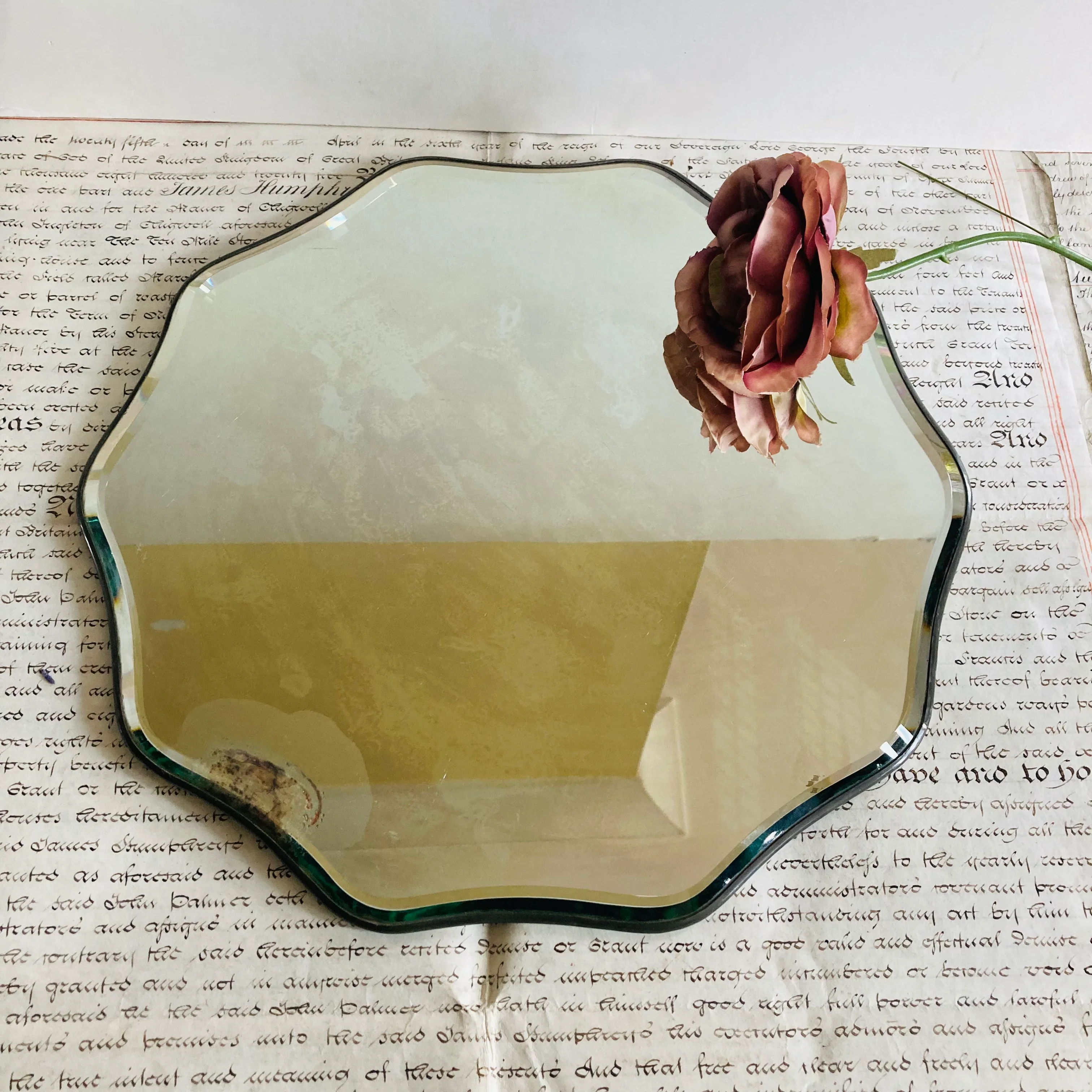 An unusual shape and rare mirror that can be hung on a wall or used as a mat, His metal backing plate has 3 ball feet and 2 hanging loop.